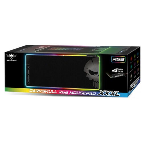Tapis de souris Spirit of gamer Darksull – Taille XXXL – Surface textile en micro-maille avec bords cousus – Base antidérapante en caoutchouc – Rétro-éclairage RGB – 12 modes de rétroéclairage – Résistant et facile à laver avec une éponge ou un linge humide – Câble USB intégré pour connexion au PC (longueur 1,8 m) – Dimensions : 900 x 400 x 4 mm + Hub USB avec 4 ports
