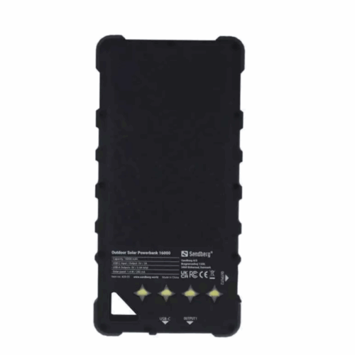 Power Bank solaire Sandberg Outdoor, Certifié IP67 anti-poussière, IP67 anti-choc et étanche, Capacité: 16000 mAh / 59,2 Wh, batterie Li-ion, Entrée/sortie USB-C: 5 V/3 A, Sorties USB-A: 5 V / 3,4 A au total, Connecteurs: 1x USB-C femelle, 2x USB-A femelle, se charge via USB ou les cellules solaires intégrées: Panneau solaire (1,4 W / 280 mA), Temps de charge au soleil: 51 heures, Temps de charge par USB 1A: 13 heures (jusqu’à 6 cycles de charge pour un smartphone typique), capacité de charger 2 appareils simultanément, Prend en charge la transmission. Indicateur de batterie à 4 LED, lampe de poche (4 x LED).
