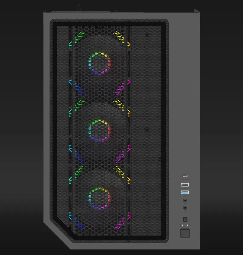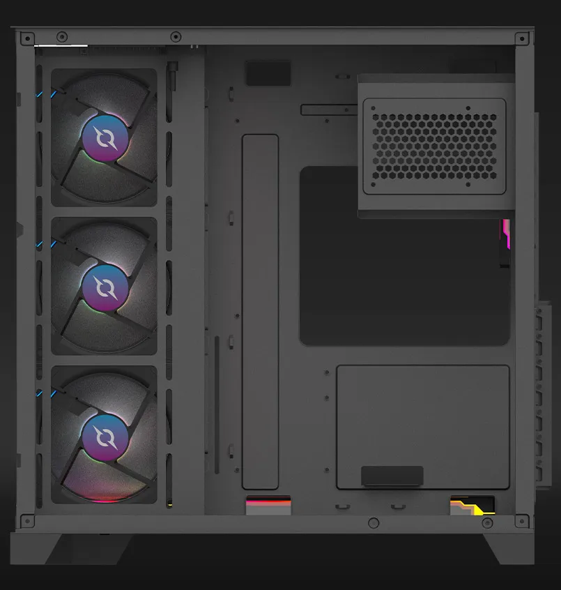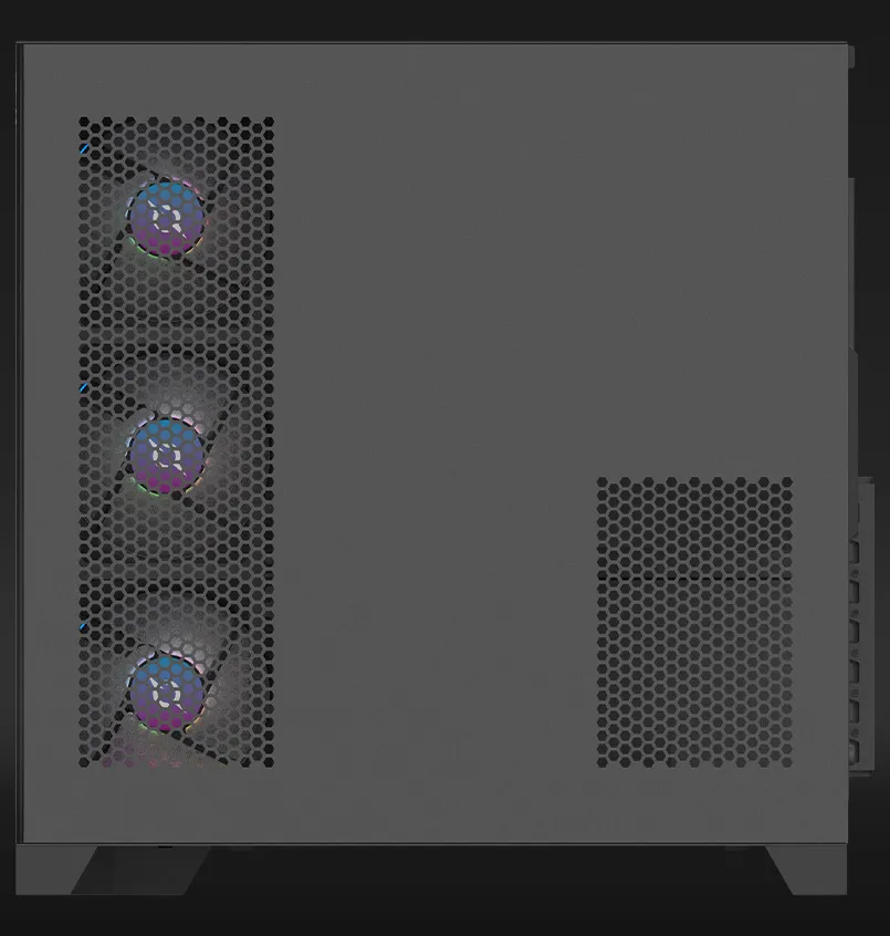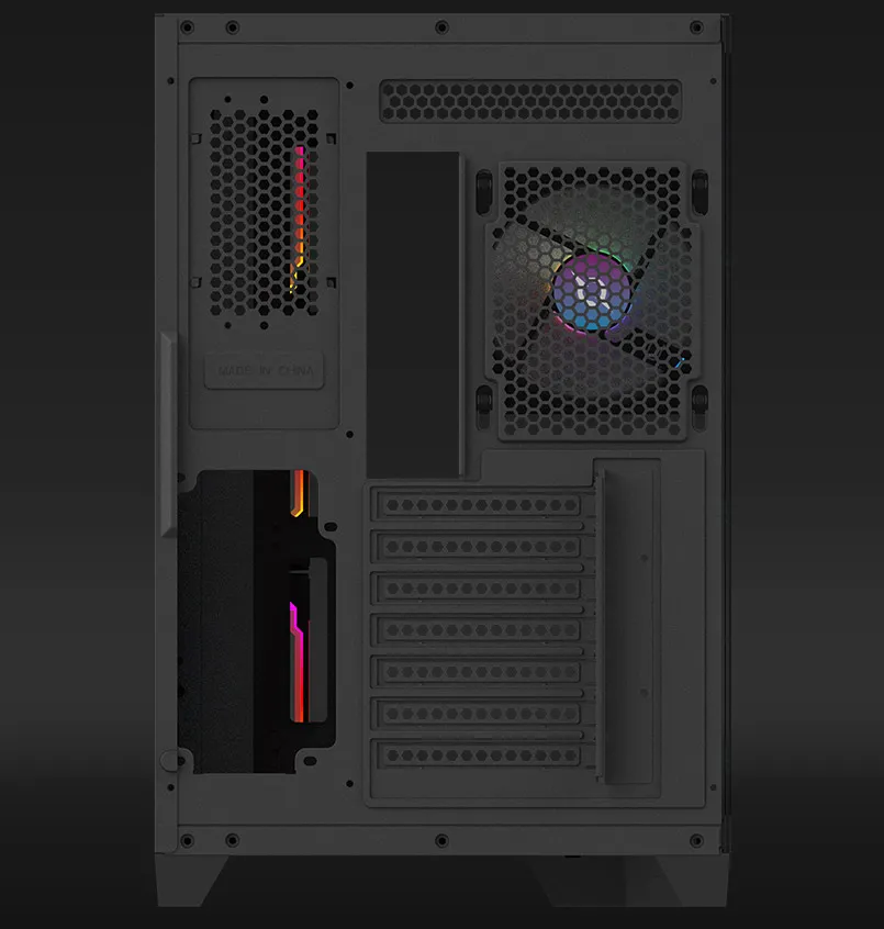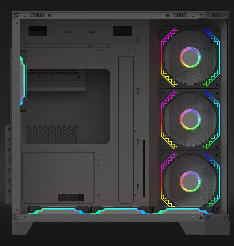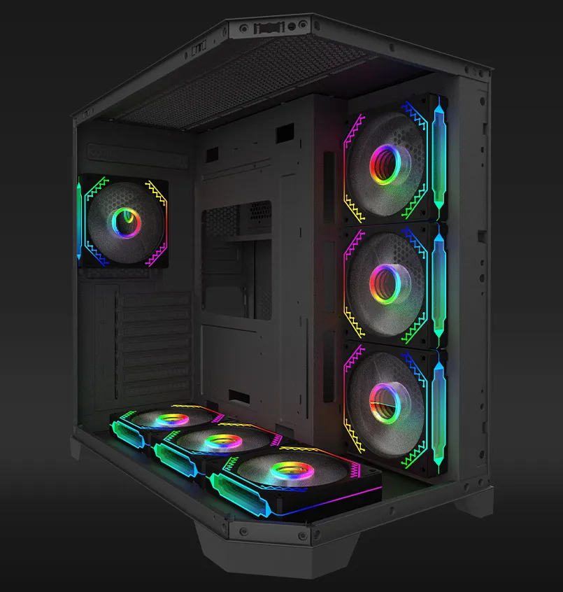 Type de boîtier : Midi Tour, Matériaux : Verre trempé (façade et panneau latéral gauche), acier SPCC 0,6 mm, ABS, Compatibilité carte mère : Mini-ITX, Micro-ATX, ATX, Compatibilité alimentation : ATX, longueur maximale de 175 mm (installation en bas), Compatibilité carte graphique : longueur maximale de 400 mm, Compatibilité refroidisseur CPU : hauteur maximale de 165 mm, Compatibilité refroidissement liquide : Oui, Panneau supérieur – 120/240/360*, Panneau latéral – 120/240/360*, Panneau arrière – 120 (*radiateurs fins de 35 mm d’épaisseur maximum), Baies de disques : 1x 3,5″, 2x 2,5″, Slots d’extension : 7, Connectique façade : 1x USB Type-C, 1x USB 3.0, 1x USB 2.0, Audio HD, Éclairage : ARGB, Ventilateurs pris en charge : 10 pièces – Arrière 1x 120 mm, Côté 3x 120 mm, Dessus 3x 120 mm, Dessous 3x 120 mm, Ventilateurs installés : 7 pièces – Arrière 1x 120 mm (ARGB), Côté 3x 120 mm (ARGB, pales inversées), Dessous 3x 120 mm (ARGB, pales inversées), Modèle de ventilateur : 6P-12DLO16B-ARGB, 6P-12DLRB16B-ARGB (ventilateurs à pales inversées), Caractéristiques spéciales : verre trempé, filtre anti-poussière magnétique amovible, compartiment alimentation, passages de câbles, Dimensions (L x l x H) : 426 x 435 x 280 mm, Poids : 5450 g, Couleur : Noir