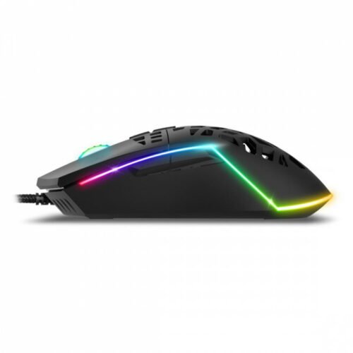 Souris : Connexion : Filaire USB-A, Éclairage : RGB 7 couleurs avec effet respiration, Boutons : 6 programmables, Résolution : Jusqu’à 6200 DPI, Design : Symétrique, ambidextre, Poids : 115 g